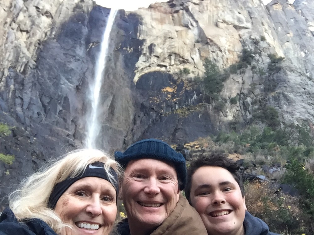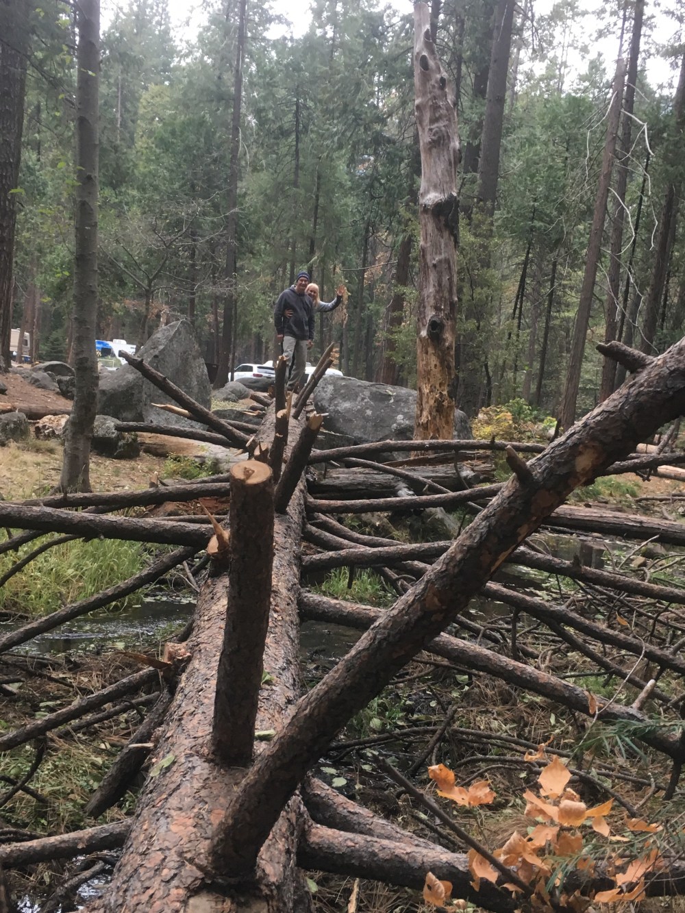 The day before Thanksgiving we headed out at 4:30am, hoping to beat the holiday traffic and the storm that was coming to Yosemite, stopping only for a potty break and Starbucks, then lunch. We arrived at Upper Pines (site 228) around 1:30 PM, the earliest we’ve ever made it! We also beat the storm. As it turned out, it didn’t snow at all that night. The forecast was for 5-8” but we later learned that must’ve been only in higher elevations. We explored the area around our site, including a small creek with lots of fallen logs, great for climbing. It rained ALL night but we were cozy in our Indy (Read about Indy here). This was our 5th time in Yosemite but our first time staying in the valley, and being in the valley for the first time was really nice and convenient. We even had decent cell service most of the time.
