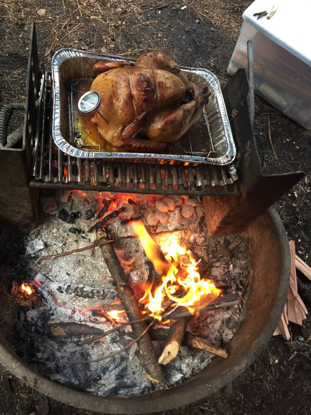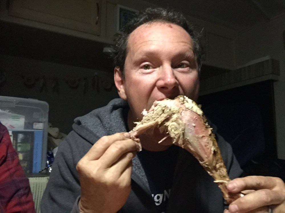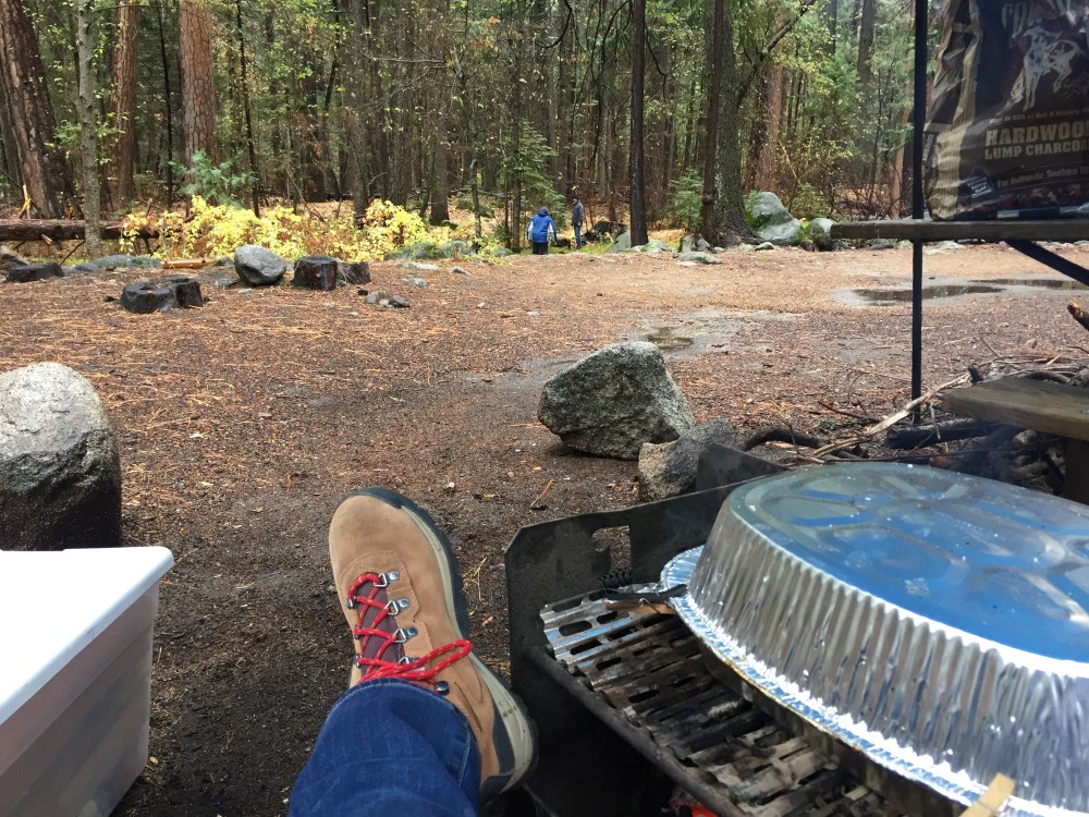 On Thanksgiving morning Scott started our turkey on the open fire pit about 9:00am. It cooked all day, and rained most of the day on & off, but we enjoyed the fire under the Easy-Up we had brought along. They guys went for a walk to find the Merced River, while I watched the turkey. We couldn’t leave the turkey unattended, of course, because of bears or even deer. Later Scott & I went for a walk & found the river, bridge, & the shuttle stop.