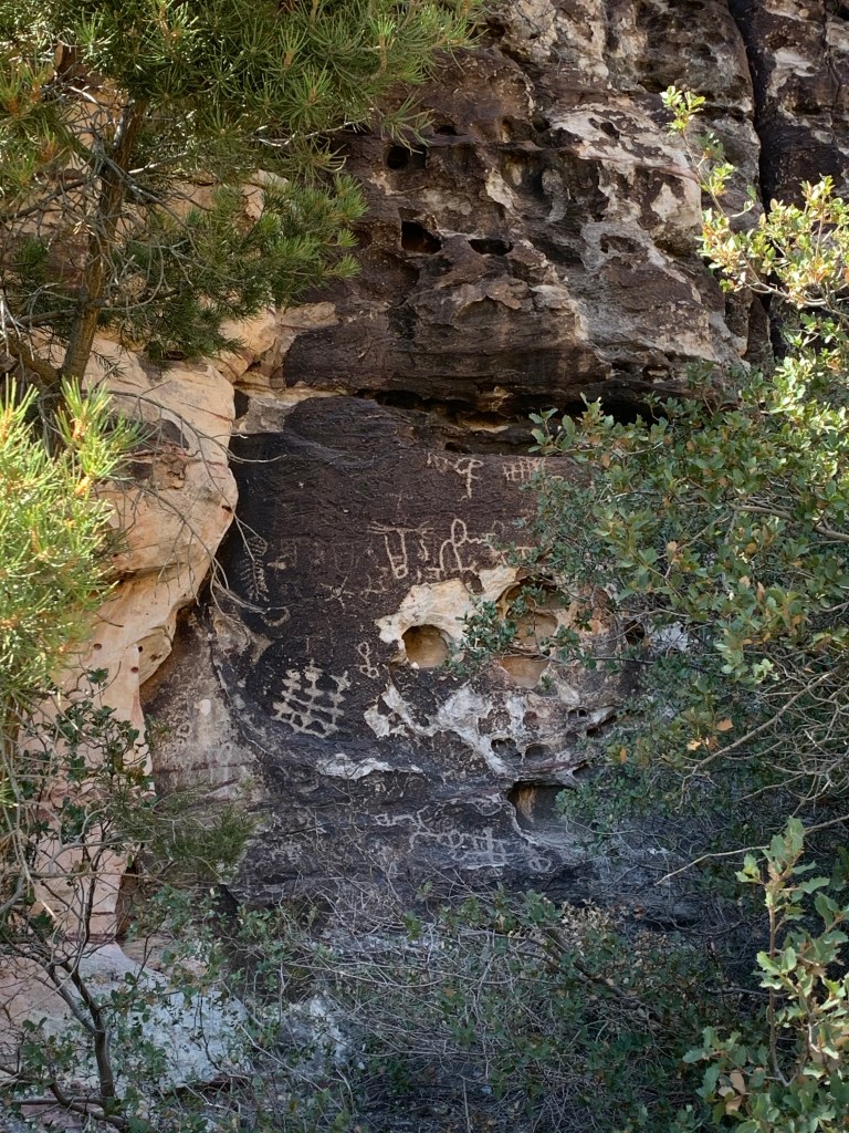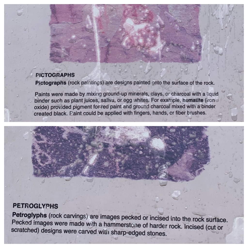 Here we first walked the Petroglyph Wall Trail, a short .15 walk to view the petroglyphs. Do you know the difference between a petroglyph and a pictograph? We didn’t!